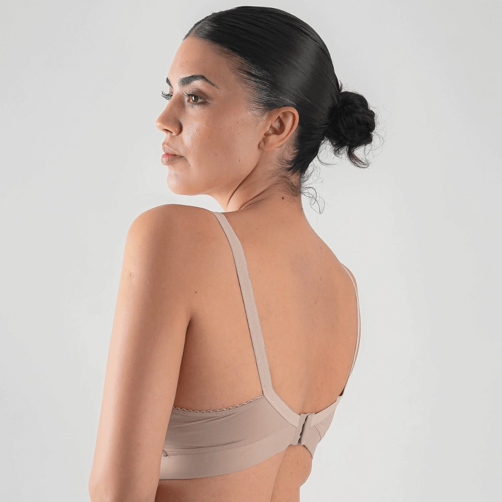 Corpiño de tricot Lucía de tela doble preformada (interna de algodón y externa de microfibra), de breteles infinitos más anchos regulables, broche trasero y elástico en bajo busto.