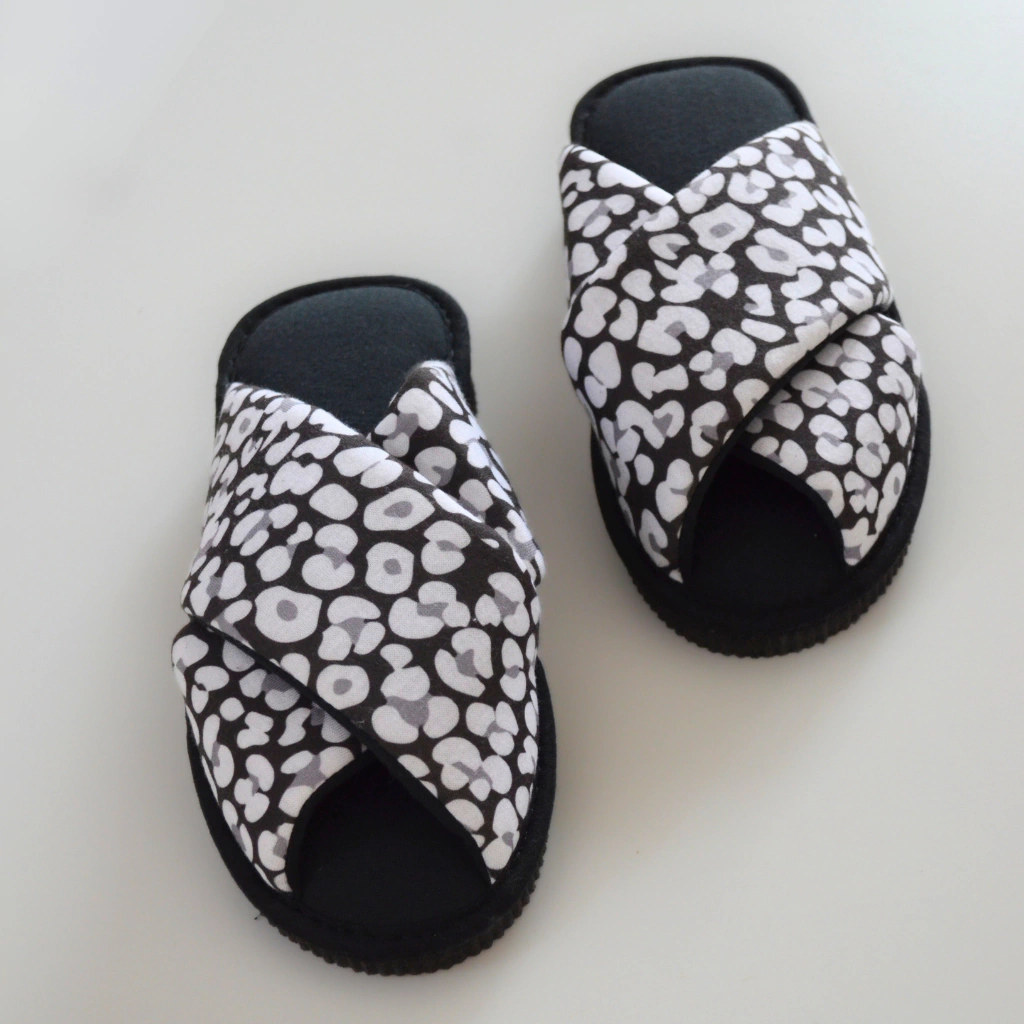 Pantuflas de algodón estampado. La capellada es abierta con tiras cruzadas superpuestas.
